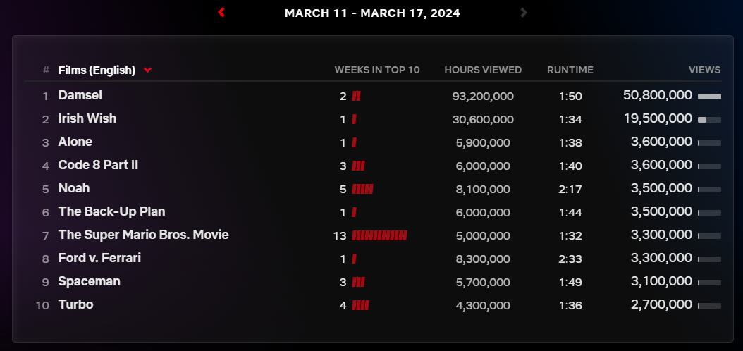 2024년 3월 11일부터 17일까지의 넷플릭스 영화 글로벌 순위입니다.