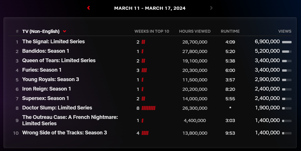 2024년 3월 11일부터 17일까지의 넷플릭스 드라마 글로벌 순위입니다.
