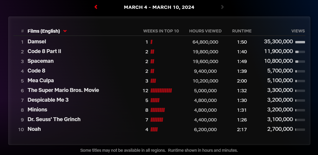 2024년 3월 4일부터 10일까지의 넷플릭스 영화 글로벌 순위입니다.