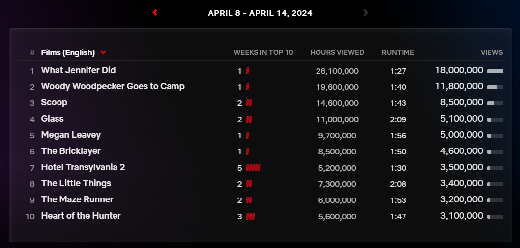 2024년 4월 8일부터 14일까지의 넷플릭스 영화 글로벌 순위입니다.