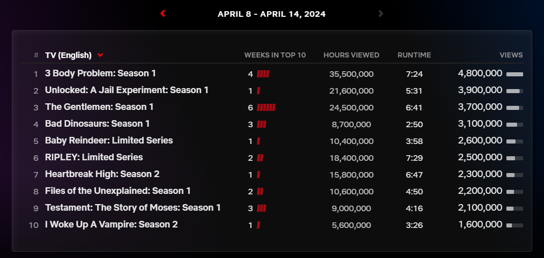 이번 주 1위는 3주 째 정상을 지키고 있는 '삼체(3 Body Problem: Season 1)'입니다. 이번 주 정상을 차지했지만 4백8십만 뷰로 지난주보다 크게 하락한 수치라, 시즌 2 제작은 어려울 전망입니다. 2위는 신작으로 리얼리티 예능인 '언록트 감옥의 실험(Unlocked: A Jail Experiment: Season 1)'입니다. 미국 아칸소의 한 구치소에서 재소자들에게 더 많은 자율성을 부여한 후 그 경과를 지켜보는 실험 리얼리티입니다. 문도 없고 교도관도 없는 구치소에서 어떤 일이 벌어질까?라는 질문에서 시작된 이 리얼리티는 매 회 긴장과 재미를 주며 인기를 얻고 있습니다.