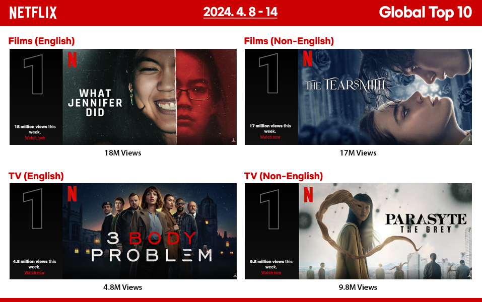 2024년 4월 8일부터 14일까지의 넷플릭스 글로벌 Top 10을 소개합니다. 영화와 TV를 영어권과 비영어권으로 각각 나눠서 소개합니다. 비영어권 영화 소개는 특별한 화제작이 없으면 생략합니다.